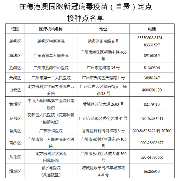 2. 广州市在穗港澳同胞新冠病毒疫苗(自费)定点接种点名单