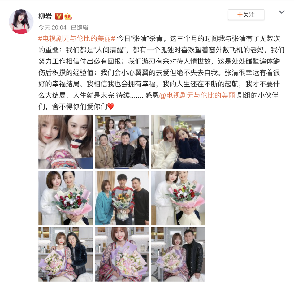 2月18日,柳岩在微博晒出与剧组主创合照,庆祝自己的新剧《无与伦比的美丽》杀青。她表示这三个月的时间自己与张清(剧中角色名)有了无数次的重叠,“我们都是‘人间清醒’,都有一个孤独时喜欢望着窗外数飞机的老妈,我们努力工作相信付出必有回报……”她觉得张清很幸运,有着很好的幸福结局,“我相信我也会拥有幸福,我的人生还在不断的起航,我才不要什么大结局,人生就是未完待续……”最后,她感恩剧组的小伙伴们,“舍不得你们爱你们”。照片中她穿白色毛衣,与娜扎、陈小纭等主创亲密合影,齐刘海短发造型十分减龄,一双大眼睛灵动有神。
