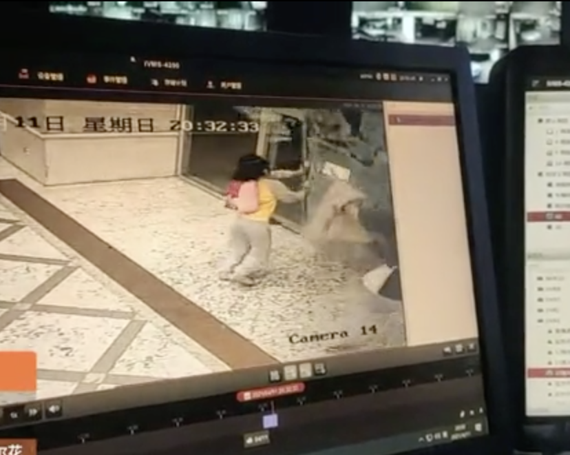 当事人黎女士介绍,当晚8点,她和6岁的女儿下楼散步,楼下时,小孩抢先一步跑到前头握住玻璃门把手,欲拉开大门。据当时监控显示,走在后头的黎女士见门没被拉开,正欲伸手碰触大门电动开关,没想到,玻璃门突然爆裂,玻璃渣劈头盖脸向母女二人砸来。