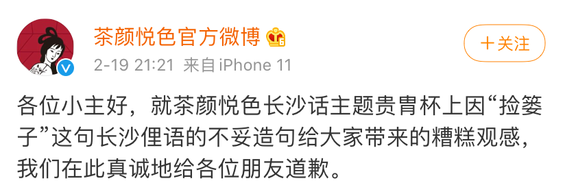2021年2月19日晚,茶颜悦色在微博致歉,并表示将立即召回该批长沙话主题马克杯。