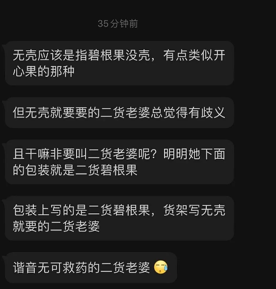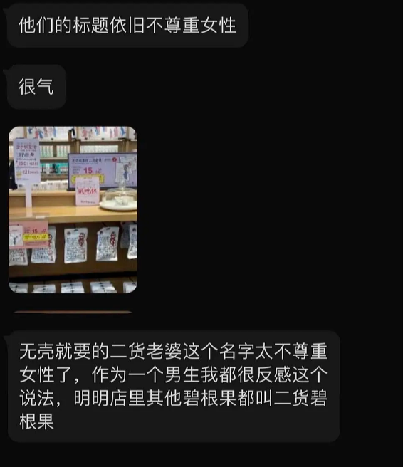 “明明店里的碧根果叫二货碧根果,为什么非要加个老婆呢,这个谐音梗让人觉得很不尊重女性,作为一个男生我都很反感这个说法。”该网友称。