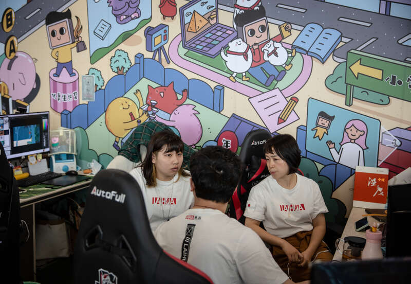 4月16日,深圳前海世贸大厦,一家创业企业里的香港青年员工们。这家企业里港籍员工数量约占3成。中青报·中青网 李峥苨/摄