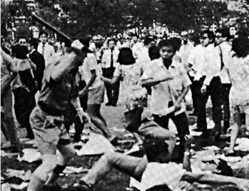 ●梁振英引用当年港英政府残暴镇压学生的照片。