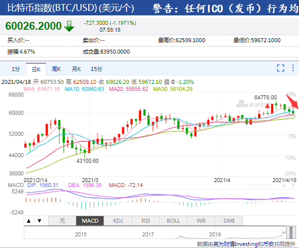 而比特币却没能连续走出狗狗币这样疯狂的行情,4月13日比特币一度突破64000美元关口,最高达到64778美元,当比特币“玩家”以为比特币会继续走高时,此时,比特币又玩起了过山车行情,近5个交易日下来,又跌回到60000美元关口附近。