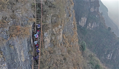 2021年1月,学生爬铁梯上学。这段铁梯是2008年修建的。