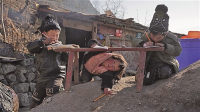 2021年1月,二坪村的学生在没有搬迁的破旧房屋外写作业。田坪村的学生会寄宿在二坪村的亲戚家中,每半月或一月回家一次。