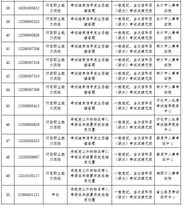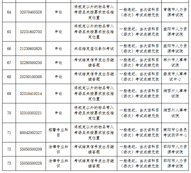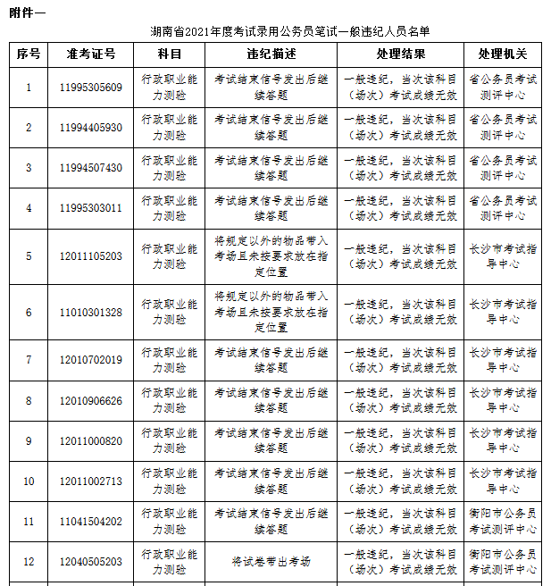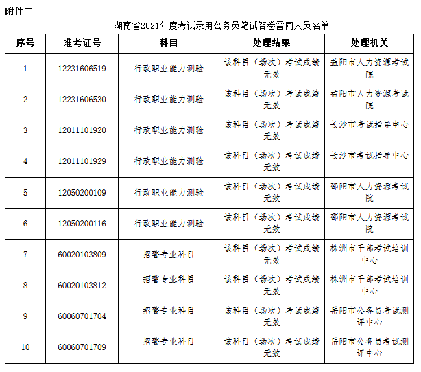 在湖南省2021年公务员录用考试笔试中,有73名考生存在一般违纪违规行为,有10名考生答卷被专业机构认定为答卷雷同(5对两两雷同),已由具体组织实施考试的考试机构或公务员主管部门依规作出处理决定并在其官网公告(具体名单附后)。