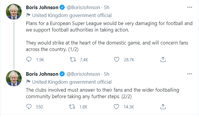 在19日凌晨,英国首相约翰逊在推特上连续发文抨击这一新体育赛事的成立,他称建立欧洲超级联赛的计划“对足球来说有巨大伤害”,并声称支持足球产业的有关部门对此采取行动。随后他还向已宣布参加联赛的球队喊话,要求他们“向球迷和公众做出解释”。