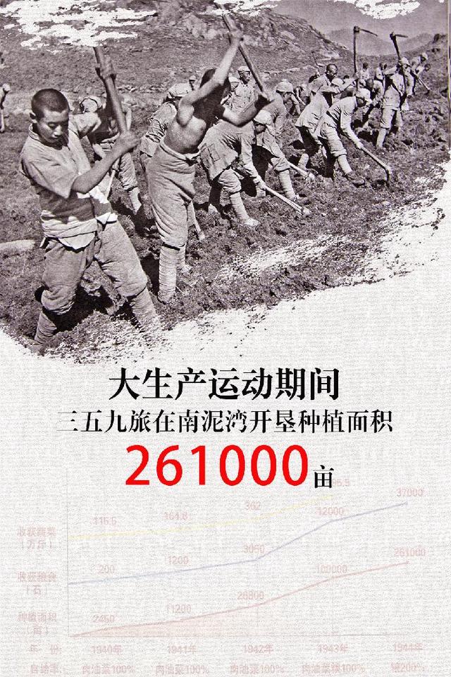 南泥湾大生产展览馆里,一组数字记录了当年三五九旅创造的农业生产奇迹:1941年,开荒种植1.12万亩,产粮1200石,蔬菜完全自给。到1943年,开荒达到10万多亩,产粮12000石,做到了粮食和经费全部自给。