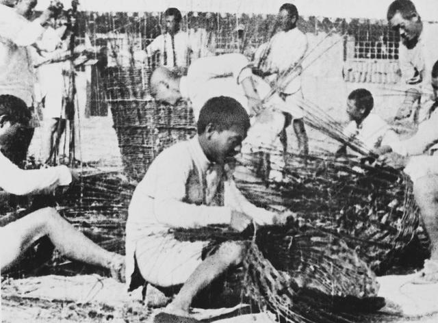 1942年,开发南泥湾的战士们用柳条编筐,克服物资缺乏带来的种种困难。(新华社资料照片)