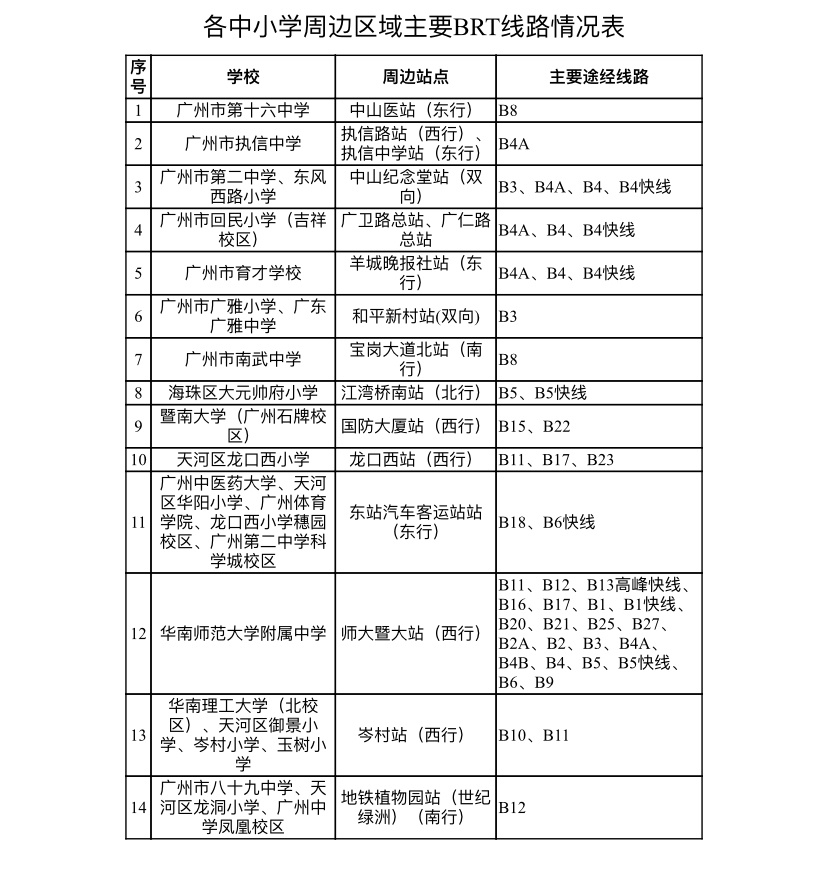 广州BRT保障营运发班,重点做好途经执信中学、培正中学、广州市第二中学、广东广雅中学、华南师范大学附属中学等周边区域的公交线路的保障工作,通过灵活调度措施,在上(放)学时段增加途经线路发班;并且根据上学客流的候乘时段需求,要求各途经BRT线路安排车辆在高峰期7点前全部出场;同时在确保BRT线路原有运力足量投放的基础上增加5%的运力作为应急后备运力,一旦客流较大,将启动应急响应,及时启用,避免出现候车时间长、乘车拥挤现象;此外在早晚高峰期间,安排专人对重点站台的客流及班次匹配情况进行检查,并根据检查结果及时调整线路发班,保障市民的正常出行。