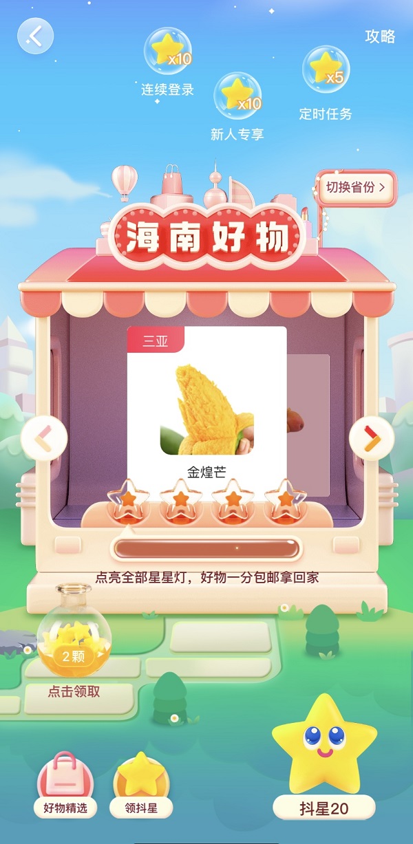 “抖星换好物”线上公益活动,作为“富域计划”的长期项目之一,旨在把供应链一线的高质量货品提供给用户,同时为各地优质商家提供更直接高效的销售渠道,助力地方经济发展。在该公益活动中,抖音用户可以通过完成活动任务收集一定数量的抖星,在平台补贴的基础上,一分钱换取来自各地的特色好商品。