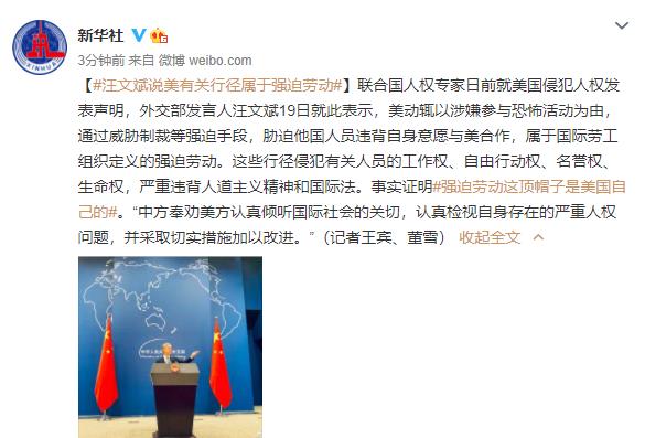 联合国人权专家日前就美国侵犯人权发表声明,外交部发言人汪文斌19日就此表示,美动辄以涉嫌参与恐怖活动为由,通过威胁制裁等强迫手段,胁迫他国人员违背自身意愿与美合作,属于国际劳工组织定义的强迫劳动。这些行径侵犯有关人员的工作权、自由行动权、名誉权、生命权,严重违背人道主义精神和国际法。事实证明强迫劳动这顶帽子是美国自己的。“中方奉劝美方认真倾听国际社会的关切,认真检视自身存在的严重人权问题,并采取切实措施加以改进。”(记者王宾、董雪)