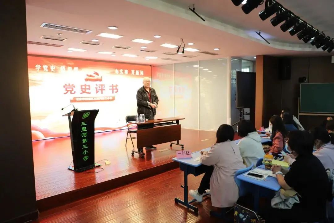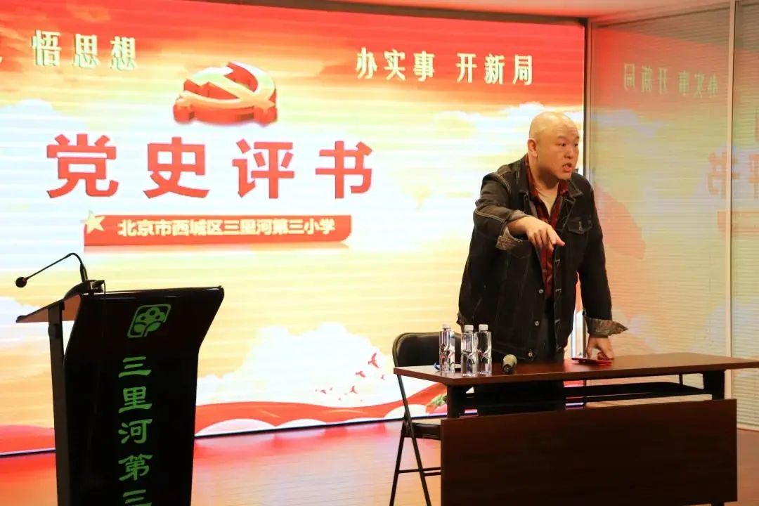 三里河第三小学联合月坛街道,邀请西城曲协主席王玥波用评书形式讲述党史故事,为老师们上了一堂生动鲜活的党史课。现场,王玥波老师以评书的形式讲述了发生在北大红楼的点滴故事,内容环环相扣、引人入胜,使学员们深刻感受到了李大钊等革命先烈的政治信仰和无私情怀,以及他们为党的事业发展作出的卓越贡献。