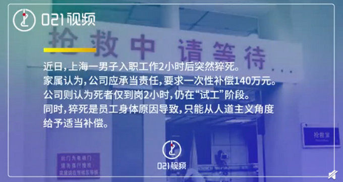 2020年10月,上海金山朱泾某防护用品公司由于工期紧张,通过松江一中介加急招聘了河南籍操作工李某。李某当晚办好手续后正式入职到岗,但两个小时李某突然晕倒在地随即不省人事。事后,家属要求公司给予一次性补偿140万元。公司则认为李某仅到岗2小时,仍在“试工阶段”,只能从人道主义角度给予适当补偿。对此事件,在接受@021视频 采访时,朱泾司法所副所长朱文表示,死者与公司的劳动关系已经形成,但根据《工伤保险条例》规定,可进行工伤认定。最终在调解员的调解下,死者家属愿积极协助公司申请工伤认定,同时公司也一次性支付人道主义补偿款。