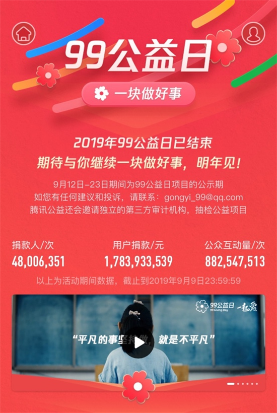 图片说明: “99公益日”通过倡导“一块做好事”,让更多普通用户参与到公益中来。腾讯公益也一直致力于公益数字化,促进透明化。