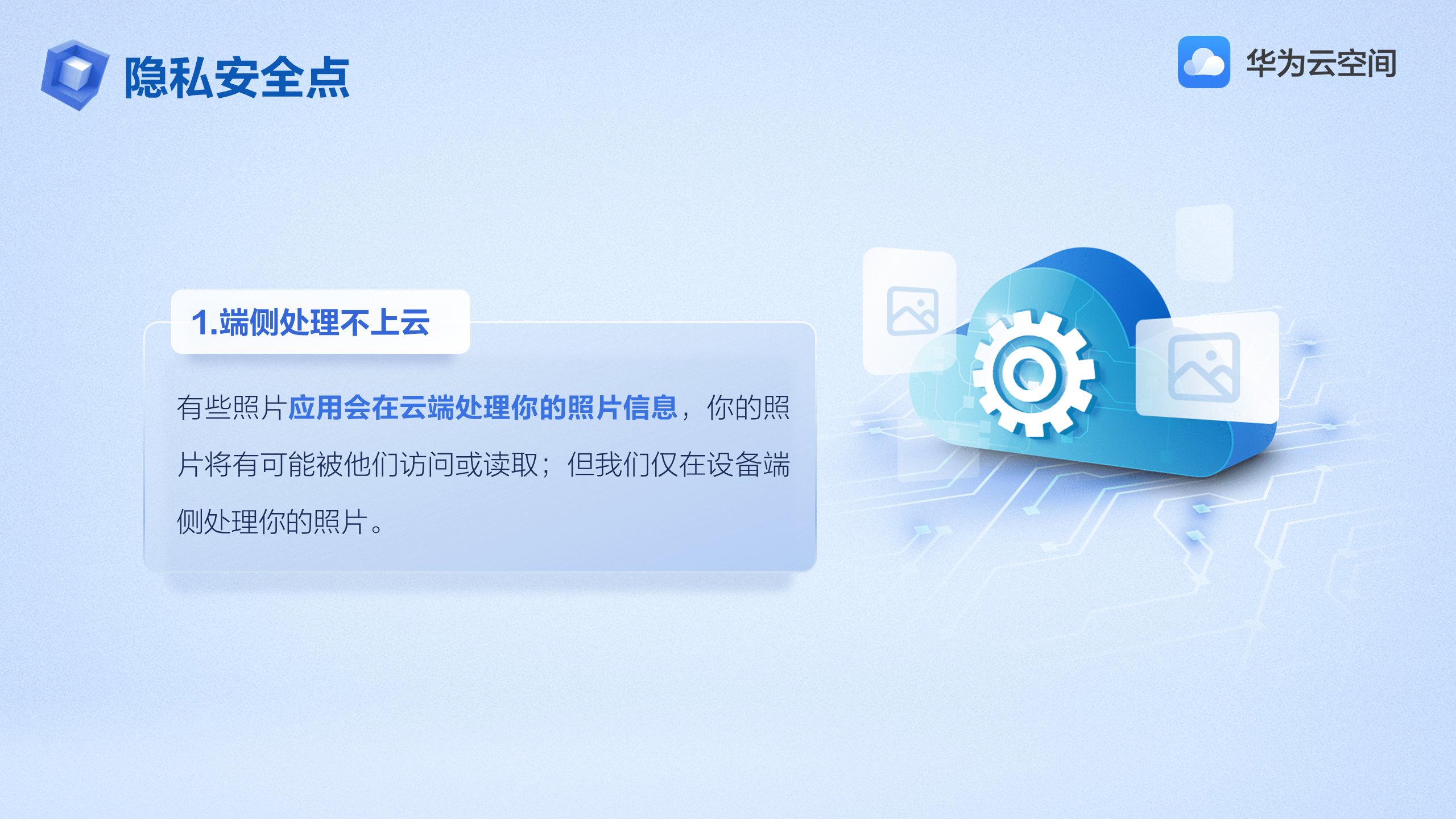 未来,华为云空间将始终把用户的数据安全和隐私保护放在核心位置,秉承华为终端云服务“创新科技保护用户隐私”的理念,持续通过先进的隐私安全技术应用,打造可信赖的云存储服务,为用户提供“你的数据,唯你可见”的安全存储体验,让用户畅享智慧数字生活。