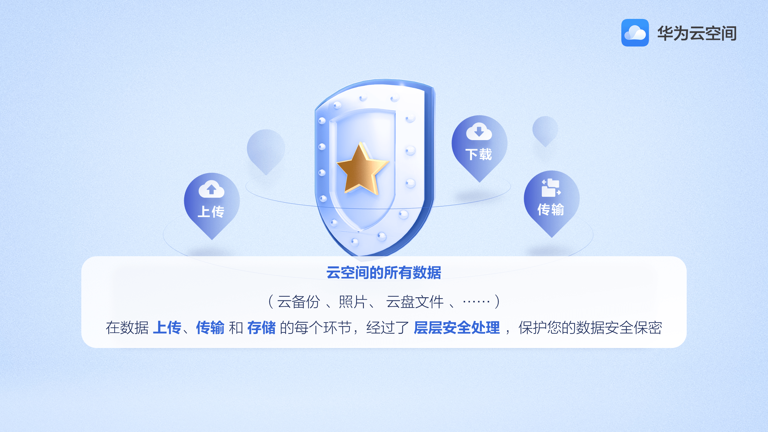 华为云空间在存储用户的数据时,会将每个文件打散成几个区块,每个区块都会经过至少128位AES密钥进行单独加密。打散后的密文区块,不会跟用户密钥存在同一服务器中,因此在没有用户密钥的情况下,即使密文区块被非法获取,用户的数据也无法被非法破解。
