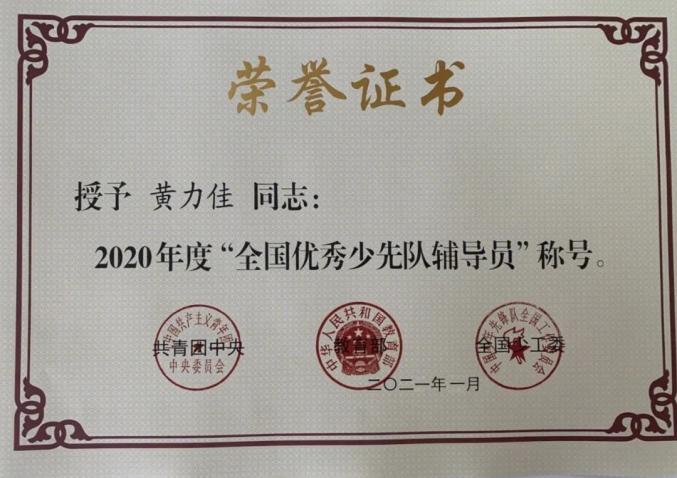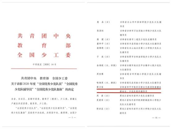 四平市铁东区联合化路消防救援站副站长,少先队校外辅导员黄力佳获共青团中央、教育部、全国少工委表彰。