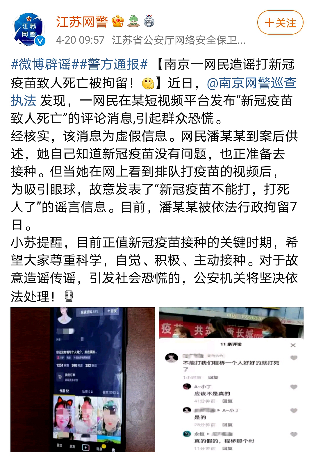 近日,南京网警巡查执法时发现一网民在某短视频平台发布“新冠疫苗致人死亡”的评论消息,引起群众恐慌。