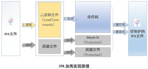 iPA动态壳保护:提取iPA文件中的可执行文件、info.plist等资源文件,通过加密程序对可执行文件链接壳代码、Mach-O文件加密,对保护后的二进制文件进行重打包、重签名后生成受保护IPA,受保护的IPA功能、性能等均不受影响。
