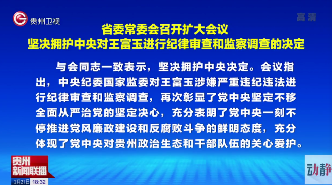 同日,贵州省委常委会召开扩大会议,传达中央对王富玉涉嫌严重违纪违法进行纪律审查和监察调查的决定。