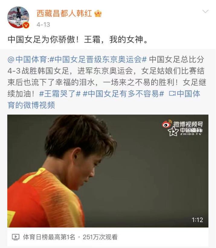 13日,凭借王霜在加时赛的绝杀,中国女足拿到了东京奥运会的最后一张入场券,歌手韩红简短的微博,道出了许多人的心声。