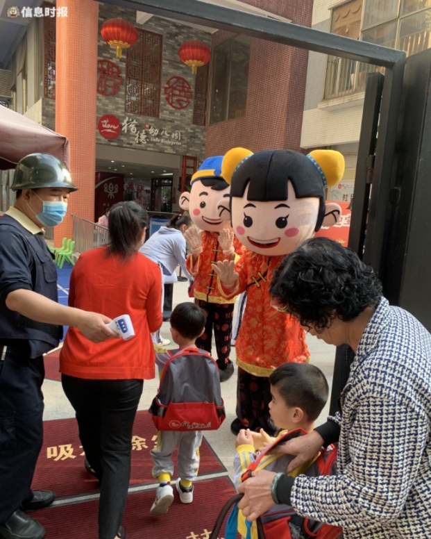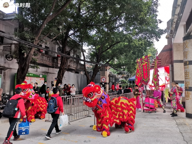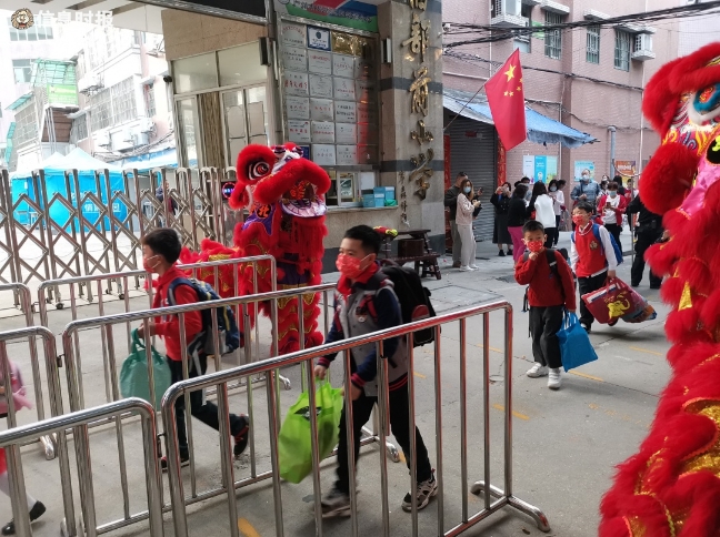 早上7点40分开始,越秀区旧部前小学的同学们陆续返回校园。为了欢迎学生,校方准备了舞狮表演,现场一片热闹的气氛。