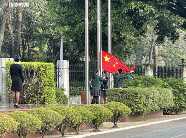 同学们迎着晨风进行了本学期第一次升旗仪式