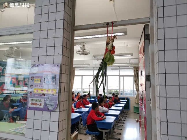 记者看到,每个班级都在门口挂上了芹菜、生菜、桔子等物品,“新的学期开始了,我们挂上这些物品,也是寄托了美好的寓意。比如桔子寓意新的一年大家吉吉利利,香葱希望孩子们聪聪明明。”
