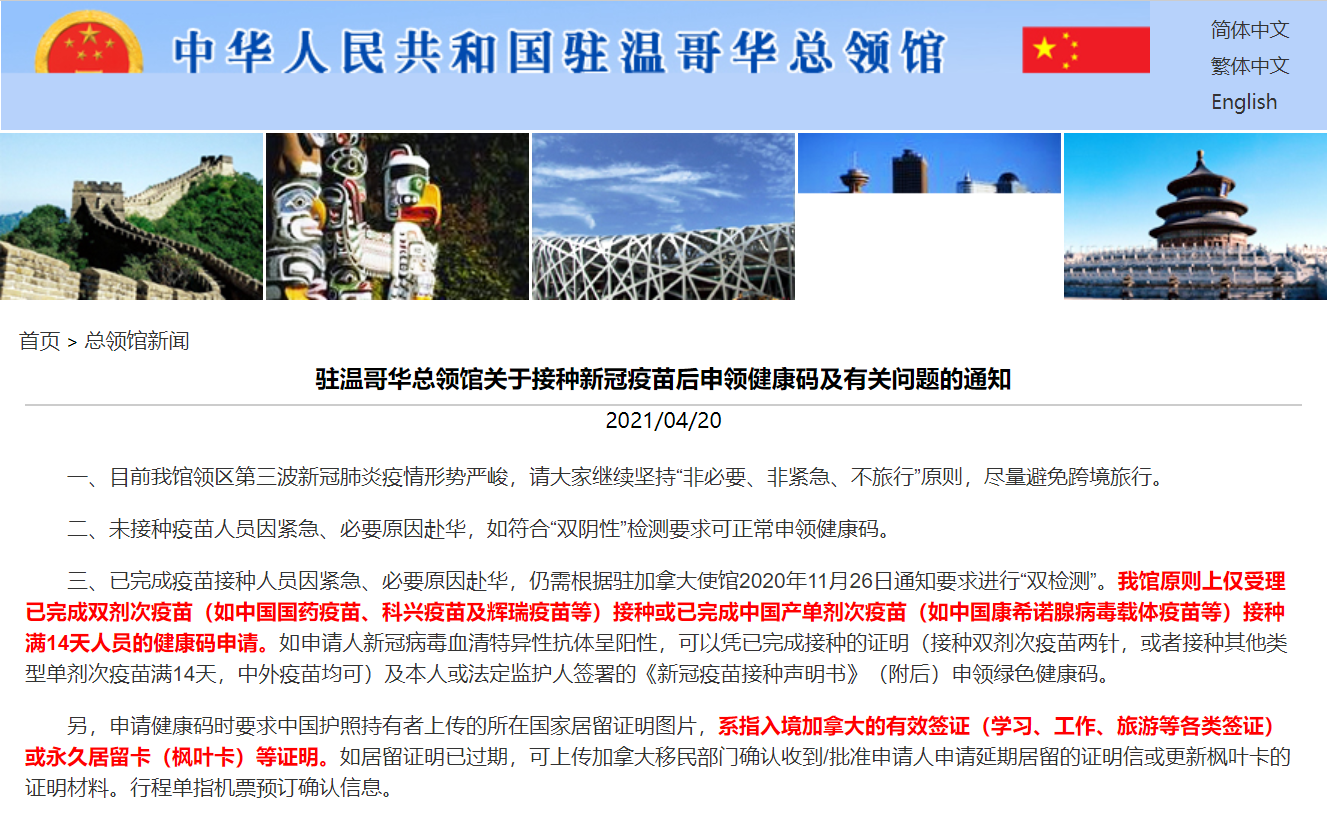 北京时间4月21日,驻温哥华总领馆发布关于接种新冠疫苗后申领健康码及有关问题的通知。