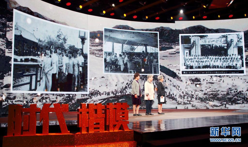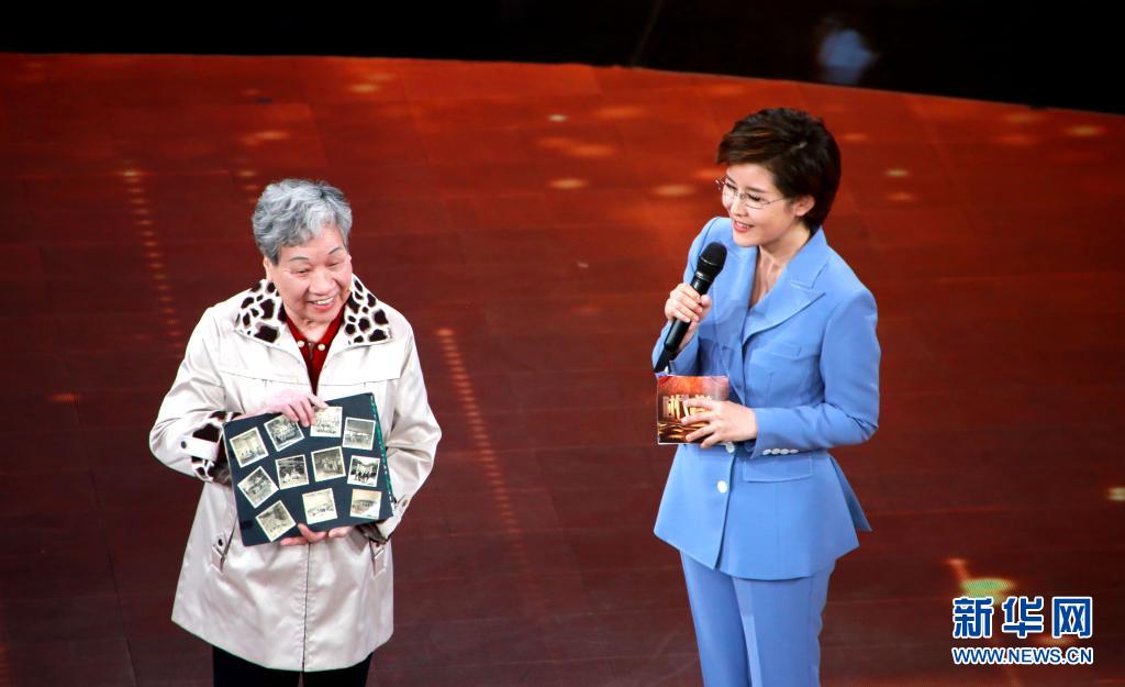 4月18日,一名东深供水工程建设者代表在“时代楷模”发布仪式上展示工程建设者的老照片。新华社记者 潘旭 摄
