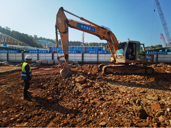 眼前是一个有上万平方米的巨大工地,泥头车在场地进进出出,头戴安全帽的工友们在紧锣密鼓地开展基坑出土施工作业。