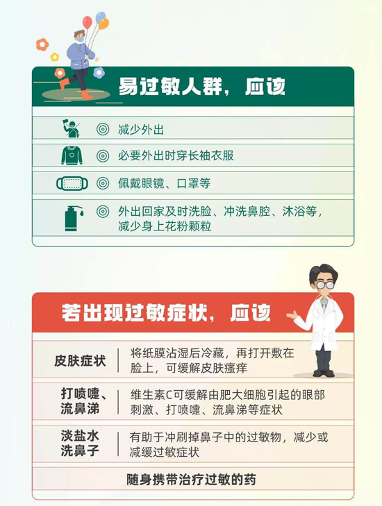 【防过敏小贴士】对易过敏人群来说,应该减少外出,注意关窗;出门戴口罩,避免到花粉浓度较高的地区;外出回家后注意洗脸尤其是清洗鼻子、眼睛,更换沾到花粉的衣物。