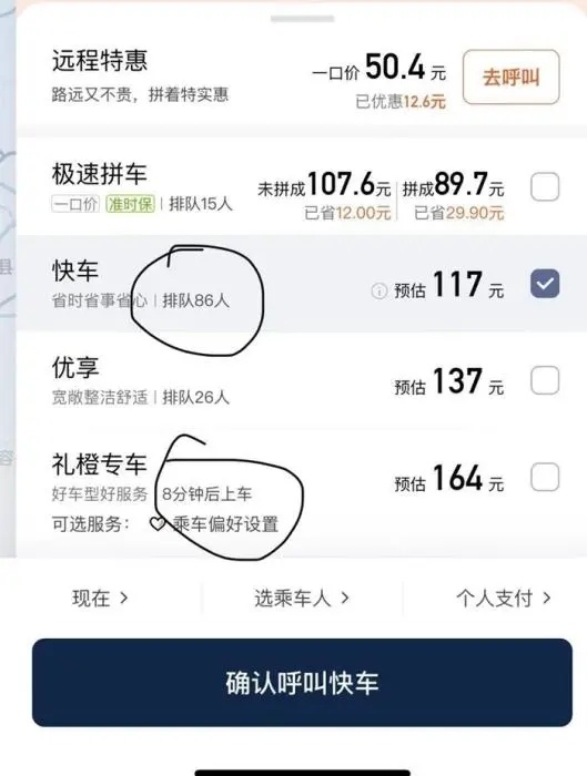 记者近日对此进行了多次测试,某日23时左右,在北京南站附近打车,滴滴平台显示,快车排队86人,优享排队26人,而更贵的礼橙专车8分钟后上车;在高德平台上,勾选多种车型,相比低价车型,价格较高的专车更容易被接单。