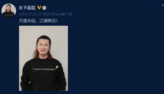 21日晚,前欢瑞副总裁姜磊在社交媒体上发文:“天涯不远,江湖再见!”并晒出自己的照片。照片中,姜磊留中长发,穿着黑色卫衣微笑,心情似乎不错。