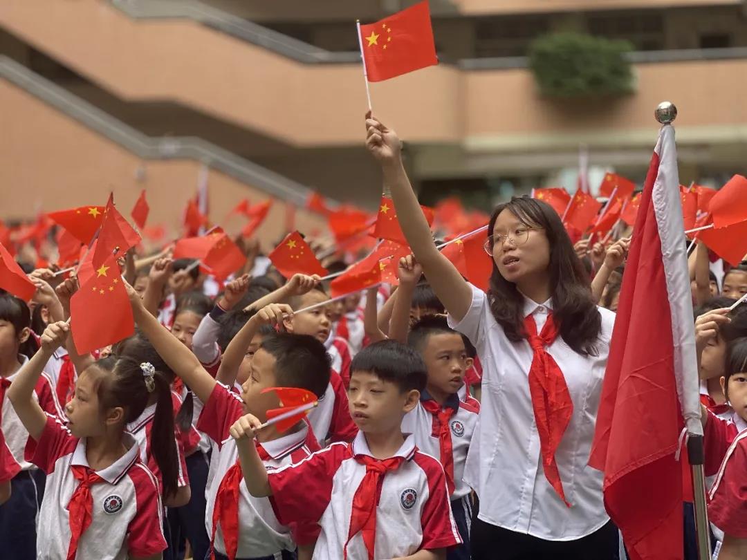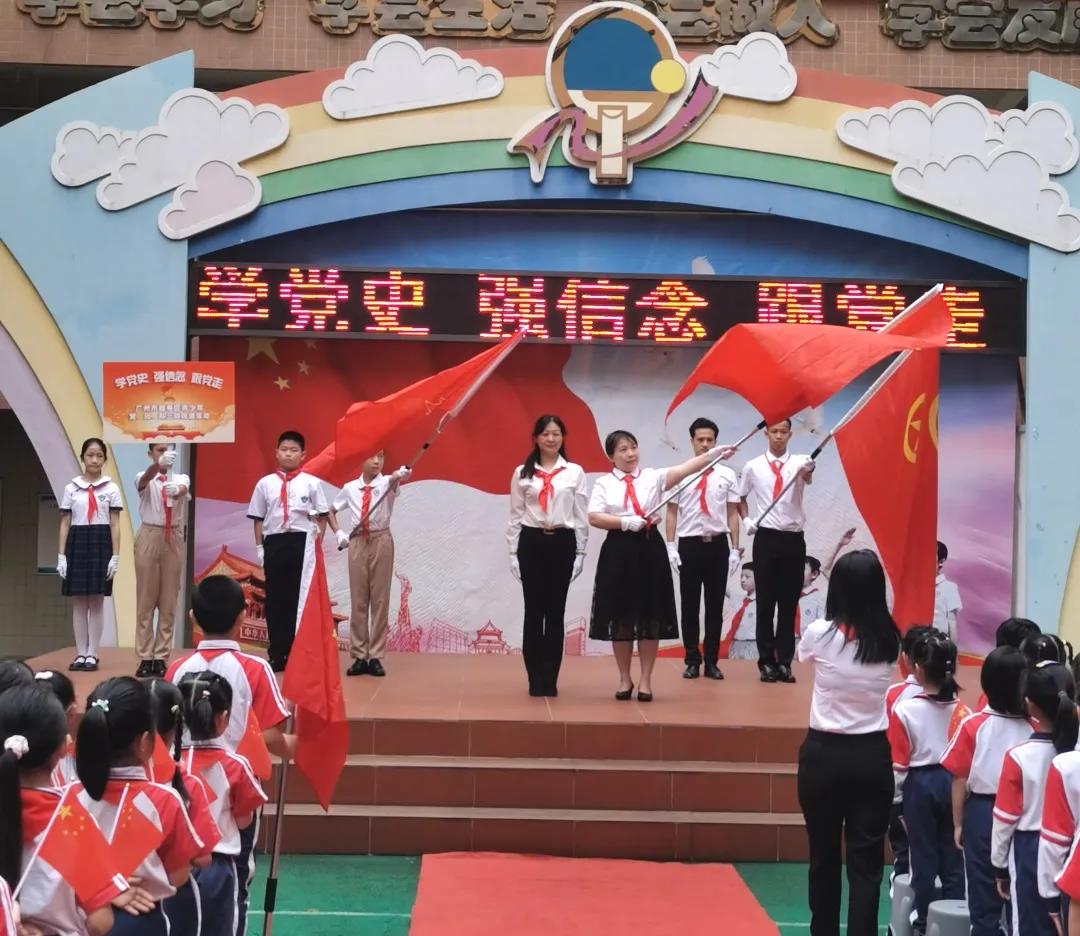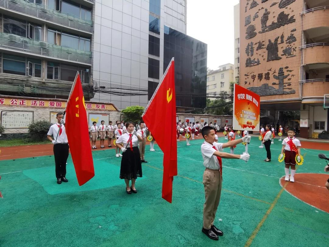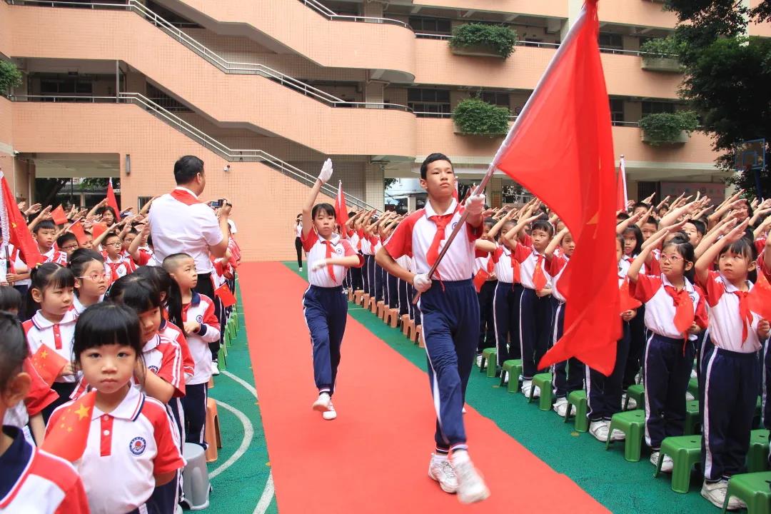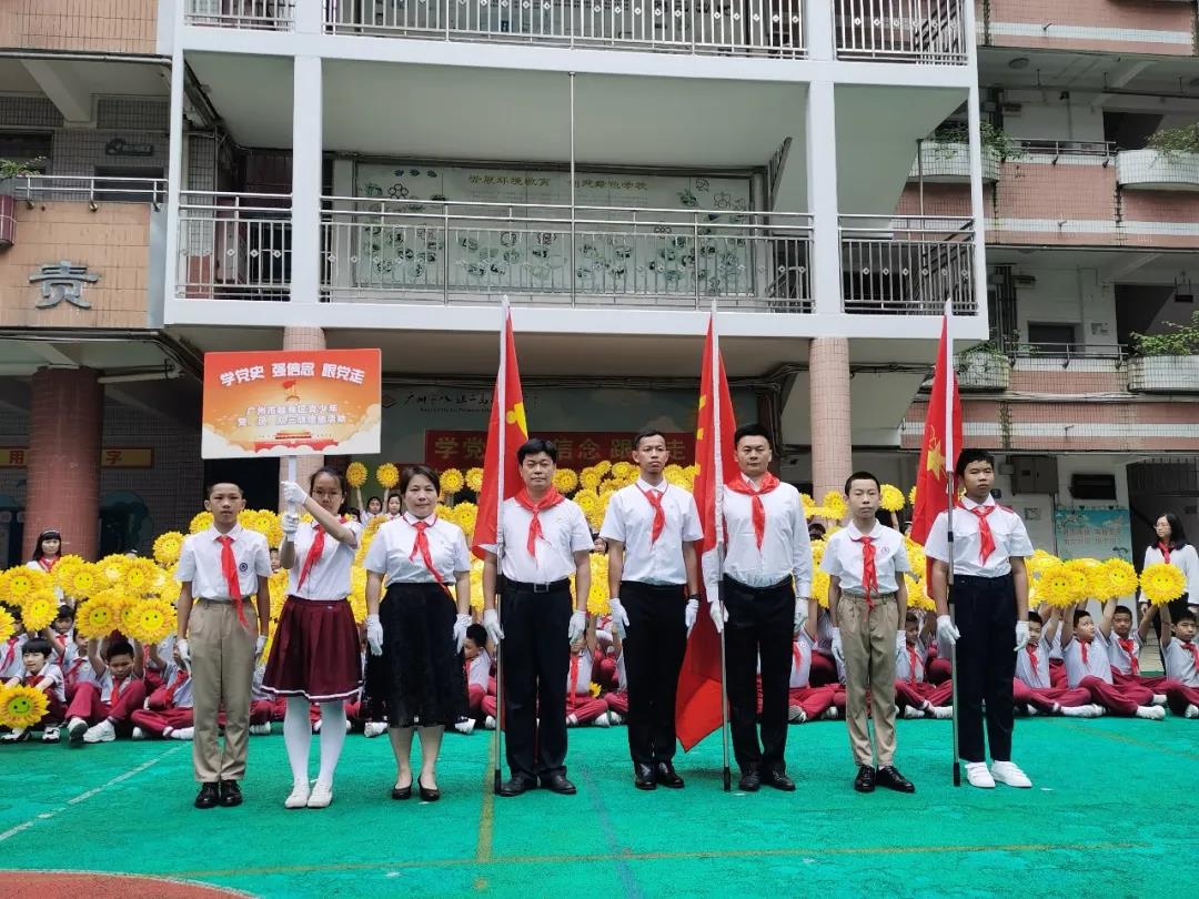 在吴海华校长、刘伟豪老师和林木栩队员的护送下,党旗、团旗、队旗传到了越秀区八旗二马路小学。
