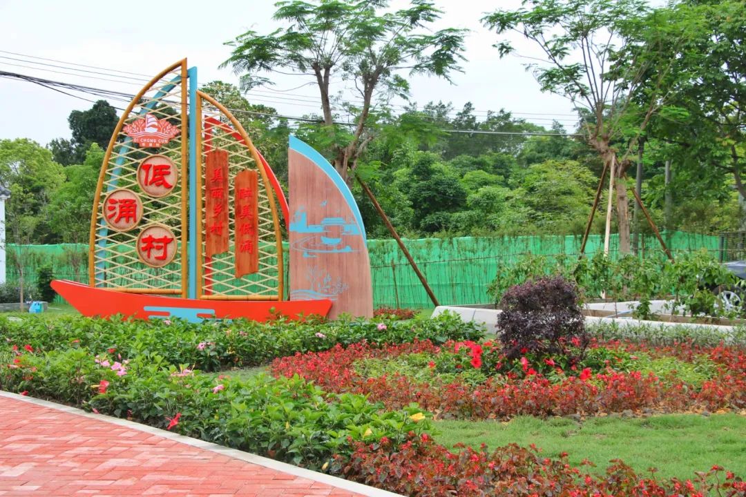 周书记介绍, 低涌村入口道路两旁原本的植被种植混乱、地面泥土裸露,杂物四处堆放,作为村入口,缺乏辨识度以及美观度。为此,低涌村对其进行绿化升级,将其打造成花卉科普基地以及党建文化公园。一条人行汀步贯穿其中,既能观赏花卉,也能了解学习党史。