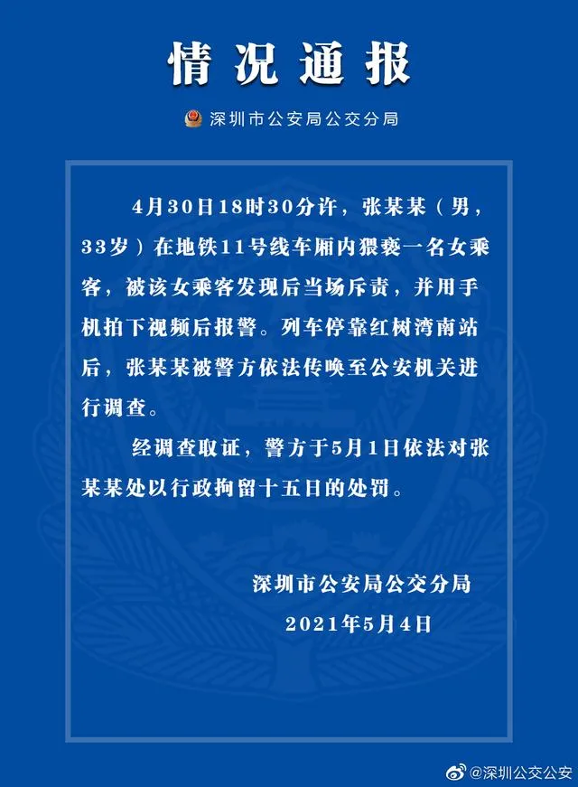 地铁11号线车厢内猥亵一名女游客
