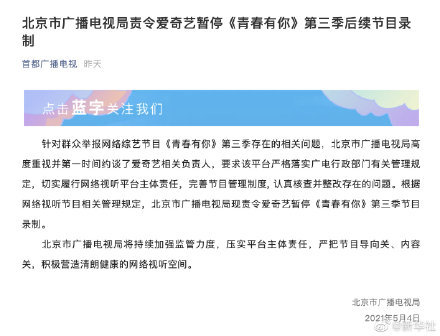 直接为“青你3”按下一个“停息键”北京广播电视局发文要求“青你3”停播整改>>>