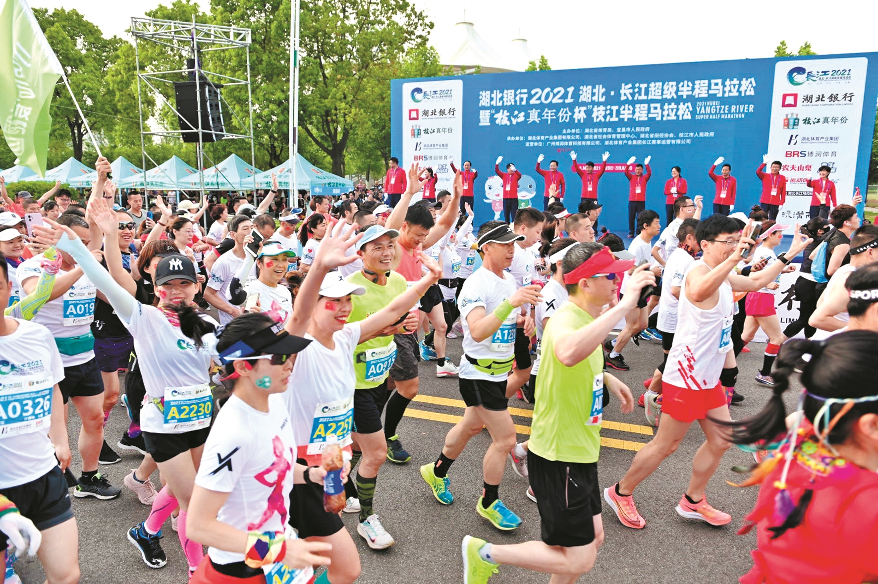 2021湖北·长江超级半程马拉松在鄂州、枝江、石首、嘉鱼、巴东五个沿江市县同时开跑。