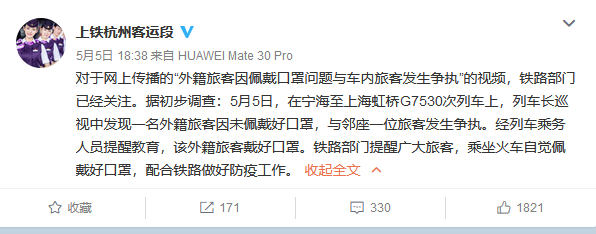 对付网上传播的“外籍搭客因佩戴口罩问题与车内搭客发生争执”的视频