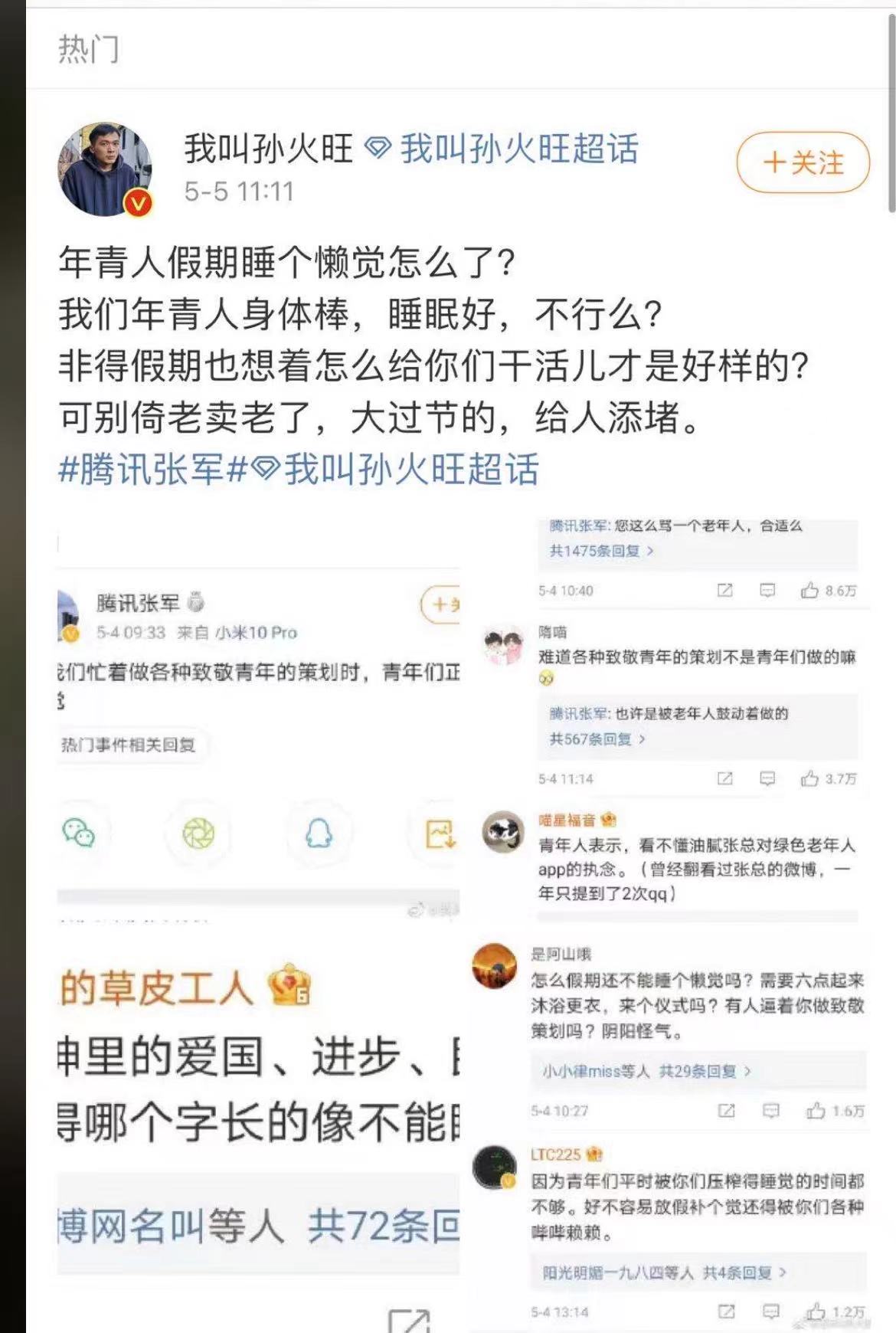 不容许人家五一睡会懒觉?”“996的青年十分艰苦放个假不睡觉难道叛逆么?掀翻你们这群资同族?”