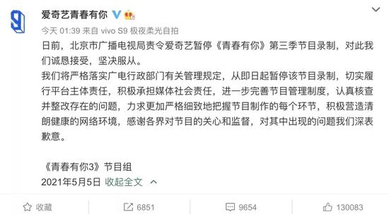 爱奇艺《青春有你》节目宣布看护布告称