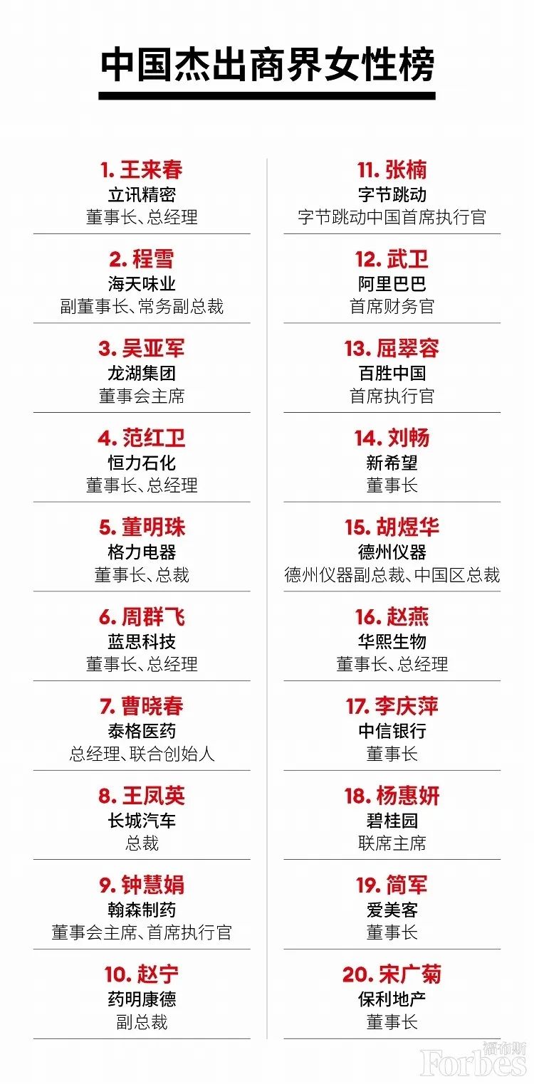 2021年度中国杰出商界女性榜Top20来源:微信号“福布斯”