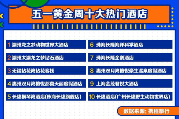 湖州龙之梦动物天下大年夜酒店、湖州太湖龙之梦钻石酒店、无锡拈花湾拈花货仓、惠州双月湾檀悦都喜天丽度假酒店、长隆横琴湾酒店(珠海长隆旗舰店)、珠海长隆海洋科学酒店、珠海长隆企鹅酒店、惠州双月湾檀悦豪生温泉度假酒店、上海金茂君悦大年夜酒店、长隆酒店(广州长隆野活跃物天下店)为今年“五一”黄金周热门酒店top10
