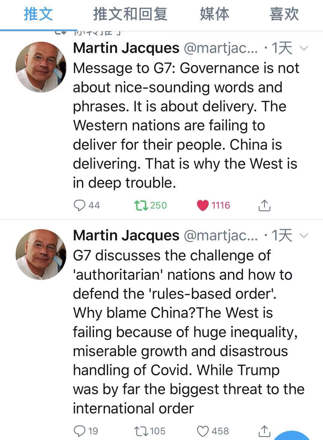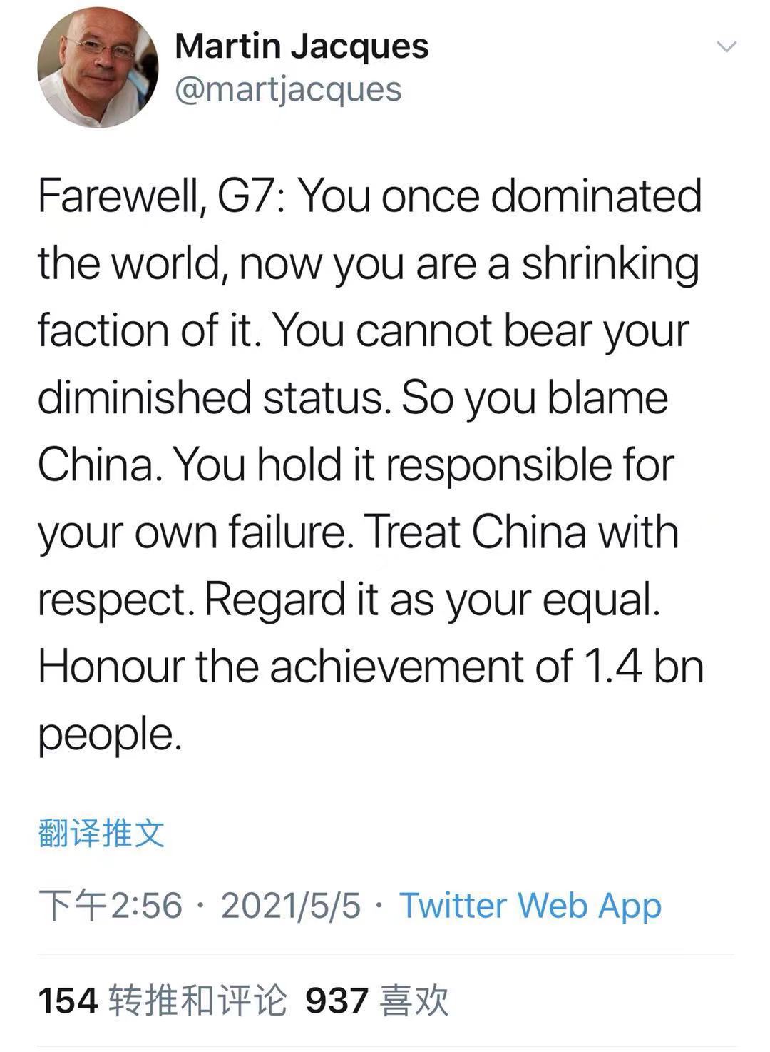 为期两天的七国峰会外长会于当地光阴5月5日在伦敦终结。英国学者马丁·雅克近日在社交媒体上就此继续发帖抨击七国集团。