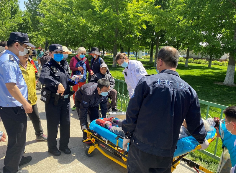 两位夷易近警帮忙急救职员将突发疾病的游园白叟送上了急救车