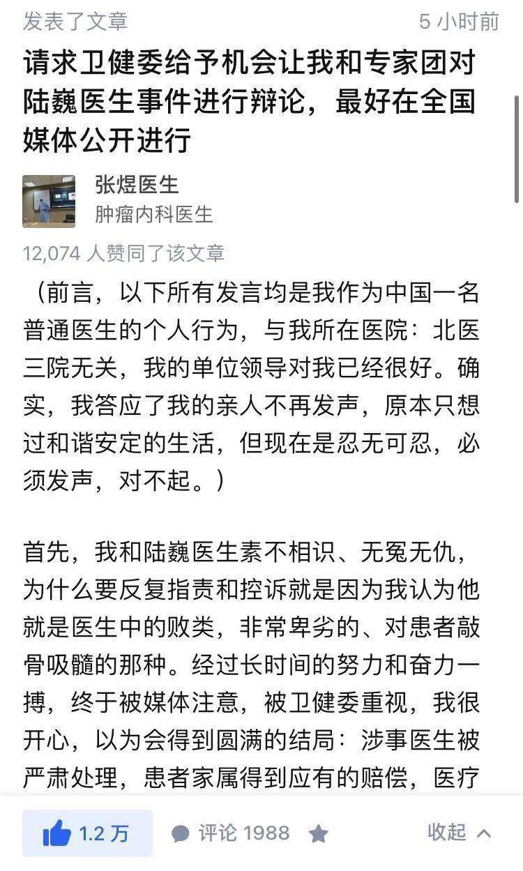 哀求国家卫健委给予时机让他和专家团对陆巍医肇事故进行公开辩论。