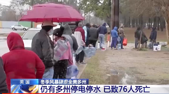 据美国媒体报道,截至目前,冬季风暴已在全美多州造成76人死亡,其中约一半在得克萨斯州。截至21日,部分地区停水断电仍在持续。